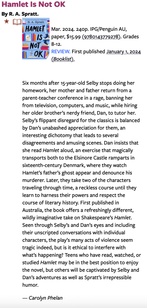 HAMLET IS NOT OK got this fantastic review from Booklist (The American Library Association’s periodical). It goes on sale in the USA in March. It will be distributed by IPG.