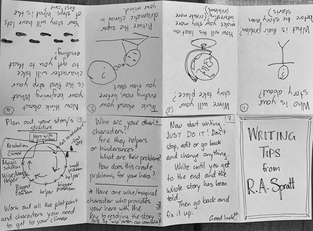 My ten year old daughter taught me how to make a zine (a mini-magazine you make out of one sheet of A4 paper), so I made one of writing tips.